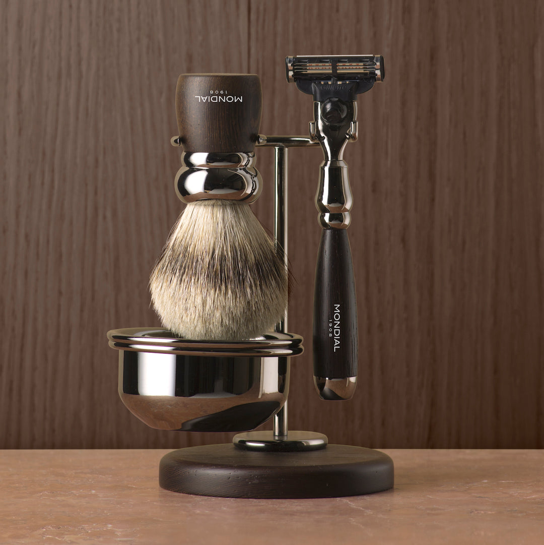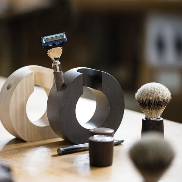 Wengé wood razors, brushes and stands shaped by classic shaving design and crowned with a chrome ring.