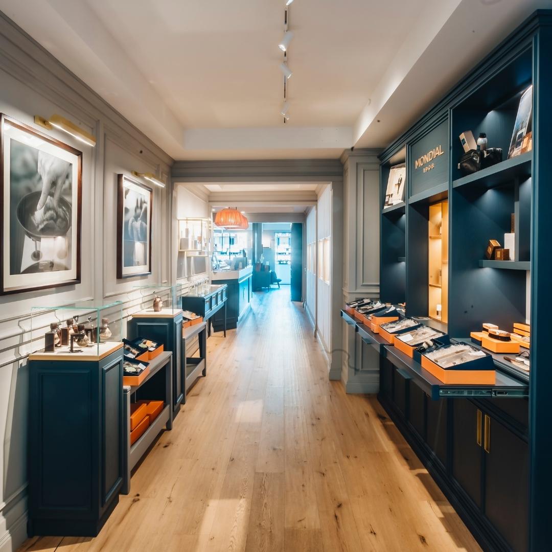 When you enter, you are greeted by carefully designed displays featuring the articles from the Mondial 1908 brand and our exclusive fragrance collections.