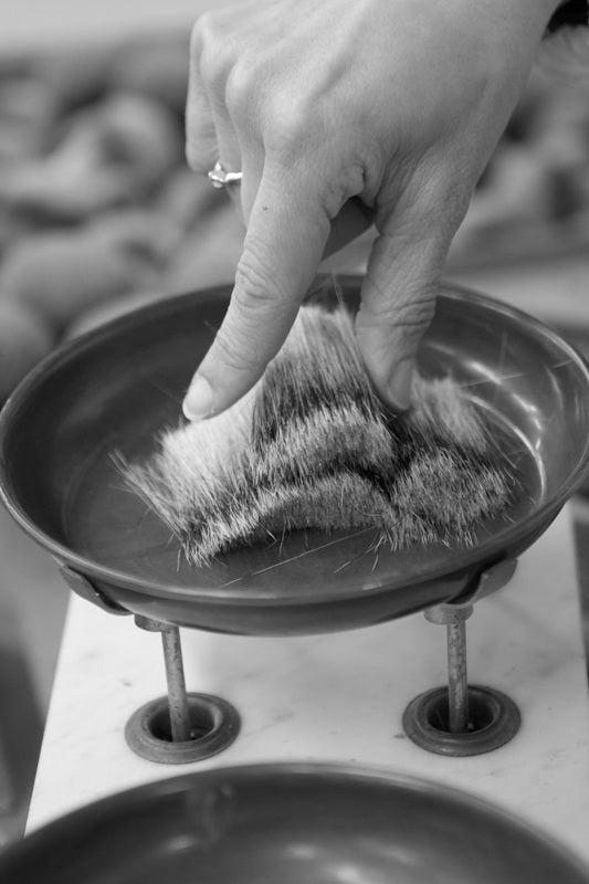From the bundles, the exact amount of hair or fibre needed is selected and weighed to ensure consistency from brush to brush.